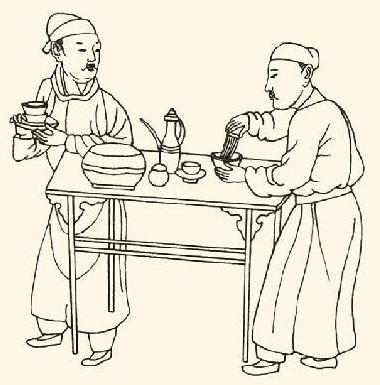 不过,像今天这样用开水冲泡散条形茶叶,是明代以后的事情,此前的饮茶方式则五花八门。比如,用开水煎煮茶叶叫“煎茶”,用开水冲泡茶末叫“点茶”。唐代的煎茶还要放米、奶、盐、姜、葱和香料,相当于麦片粥。(此事相当复杂,一言难尽,请综合参看李斌城等《隋唐五代社会生活史》,朱瑞熙等《宋辽西夏金社会生活史》,史卫民《元代社会生活史》,(日本)冈仓天心《茶之书》,(日本)小岛毅《中国思想和宗教的奔流》。)