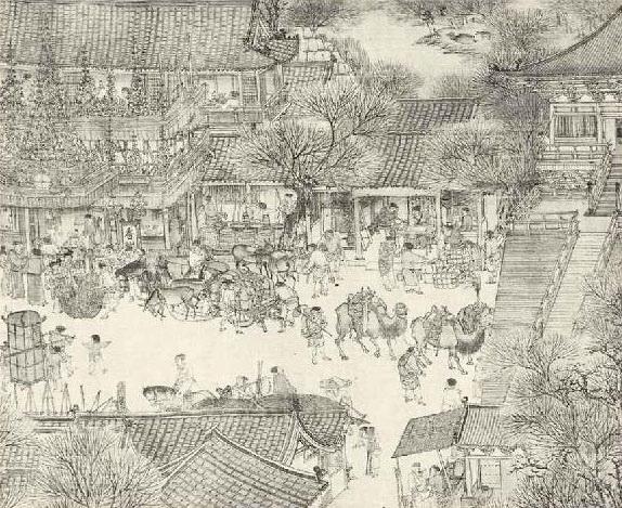 据《清明上河图》后半段部分。图中可见驼队、商贩和行人。画面右侧是城门。