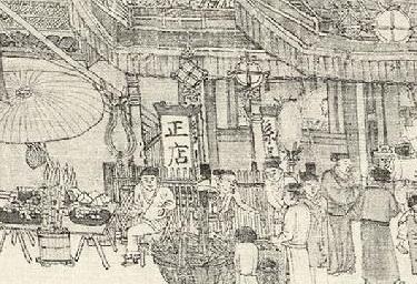 第三种方式是官酿官卖。国营酒厂直属,可以批零兼营的酒楼叫正库或正店,从正店批来官酒零售的叫脚店。脚店和正店在《清明上河图》中都有,某正店门口还悬挂着红栀子花灯,表示有陪酒女郎乃至色情服务。元代甚至在官酿新酒上市时组织歌女游行,类似于今天的车模。(正店见孟元老《东京梦华录》卷二及李合群注,正库见《水浒传》第三十九回,以上所述酒类专卖请参看施正康、施惠康《水浒纵横谈》。)