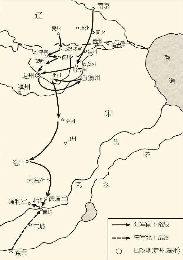 契丹人是闰九月初八从他们的南京,也就是今天的北京大举南下的。有备而来的辽军势如破竹,很快就在十五日和十六日两天,先后攻陷位于今天河北省安新县的唐兴、保定市徐水区的遂城,眼看就要突破大宋北部防线,长驱直入。(见《辽史·圣宗本纪五》,邓广铭《辽宋夏金史讲义》,台湾三军大学《中国历代战争史》。唐兴又称顺安军。)